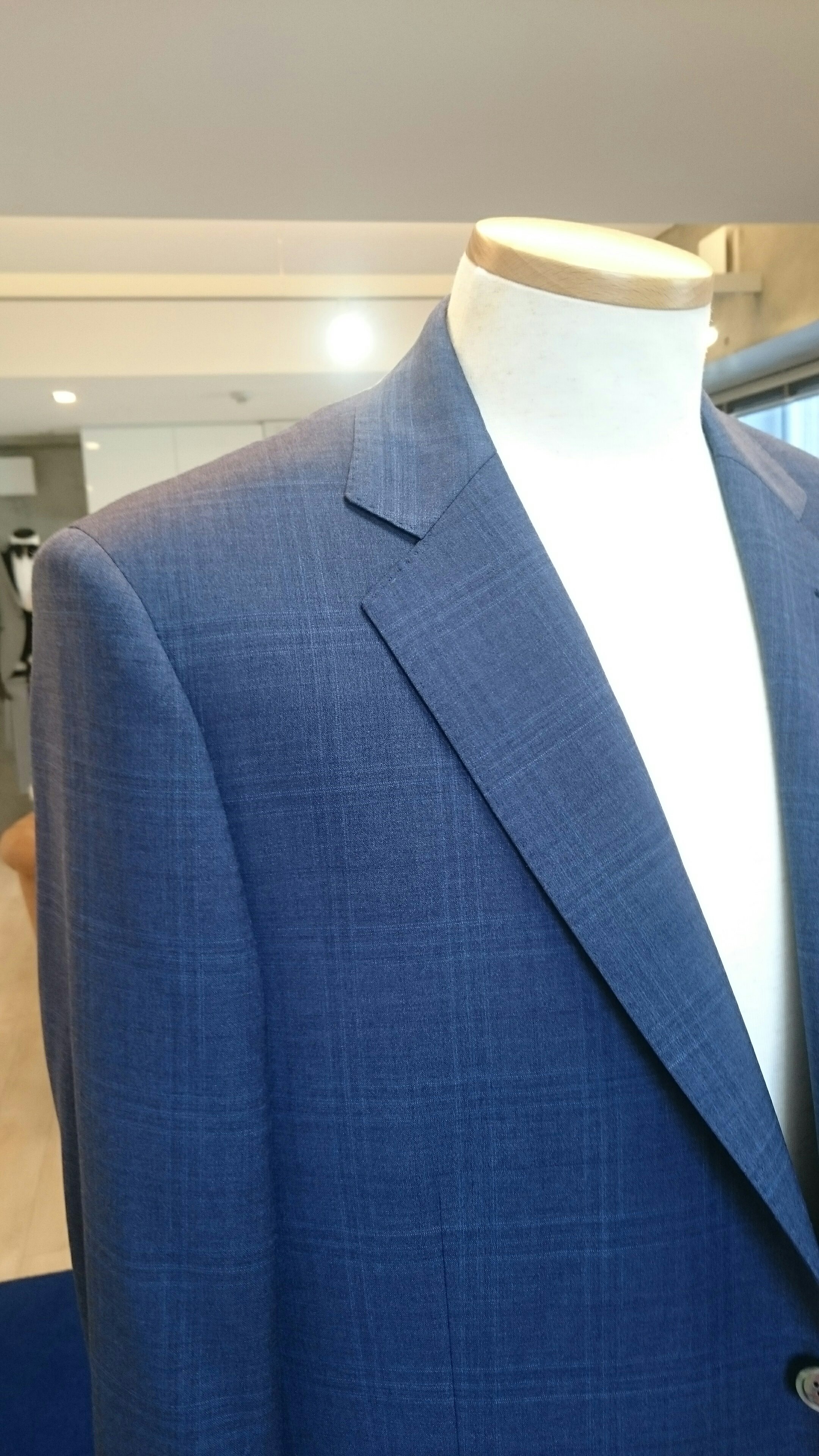 春らしい少し淡く柔らかいカラーのブルーグレースーツが人気です。今季もチェック柄のコレクションが多く人気です。イタリア・ビエレッシーより。
